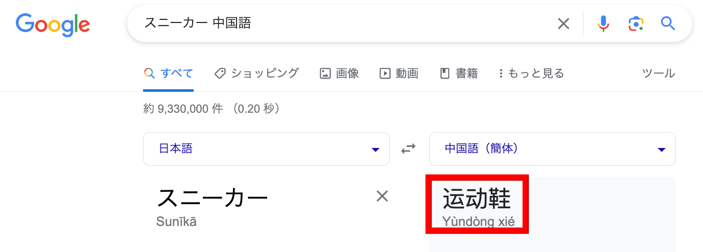 GoogleChromeで「スニーカー 中国語」と検索すると「运动鞋」だとわかります。