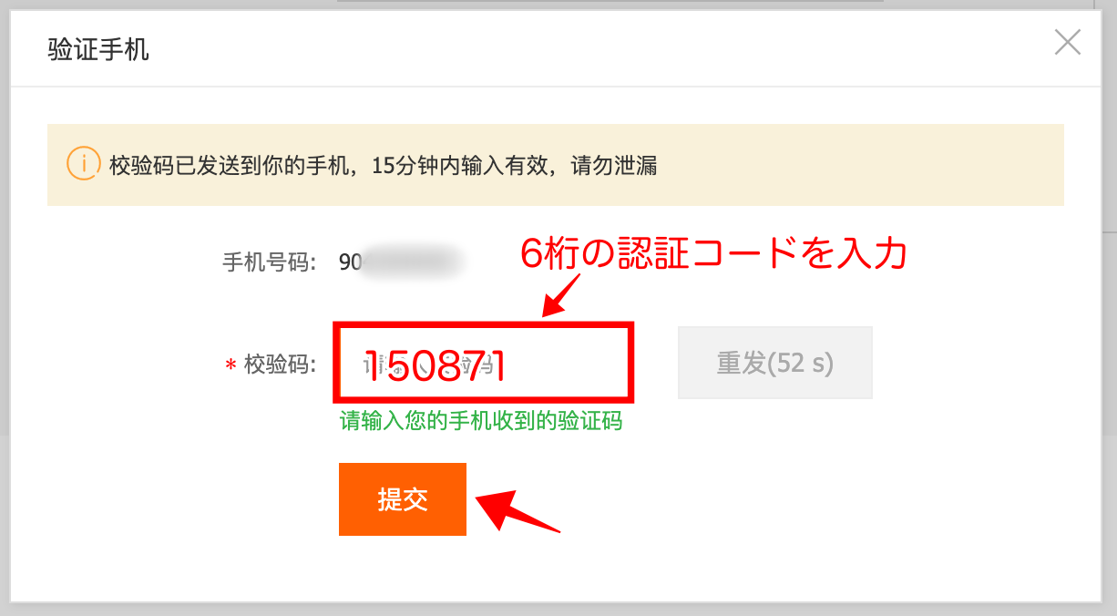 先ほど登録した携帯電話番号宛にSMS(ショートメッセージサービス)で6桁の認証コードが送られてきますので、その6桁の認証コードを入力し、一番下の「提交」ボタンをクリックします。